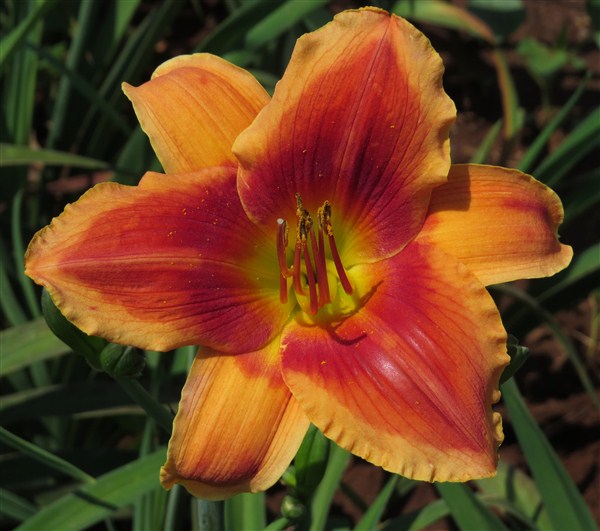 Glowing orange with triangular shaped paprika red eye zone above lime green throat;