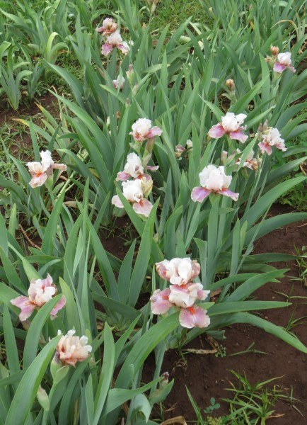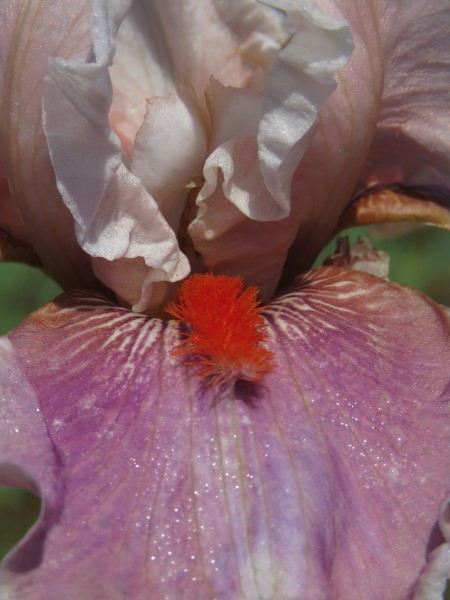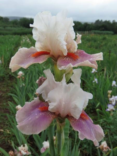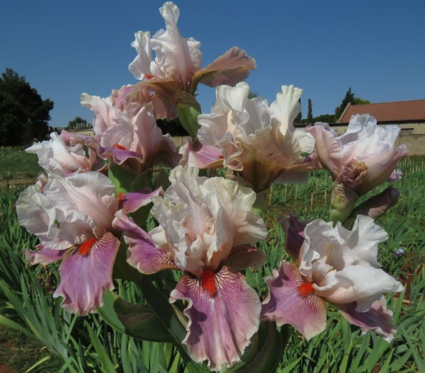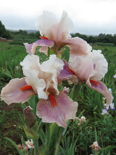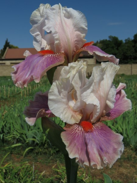 Standards: White, often pink infusion around midrib; Falls: Strong bluish rose pink; Beards: Mandarin red beard; Scape height: 91 cm; Early to early mid season bloomer.