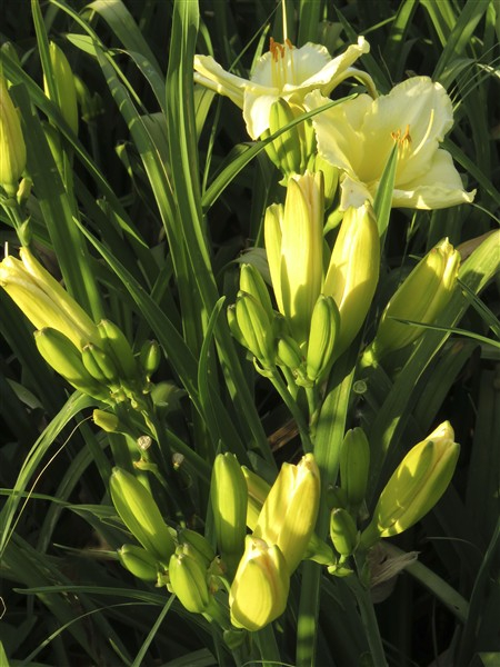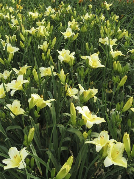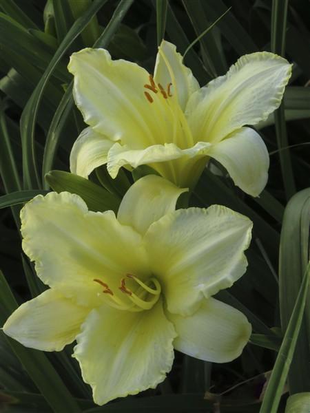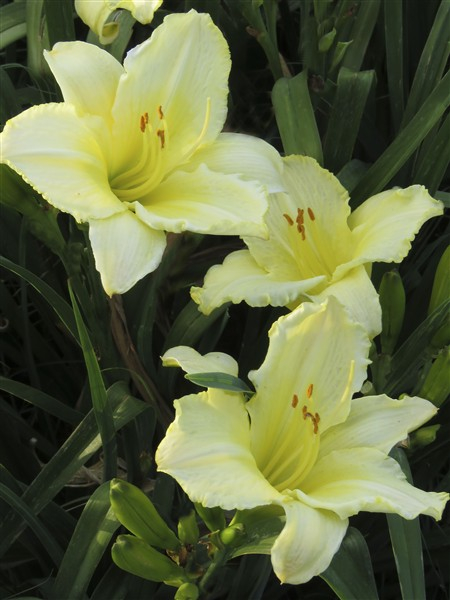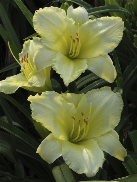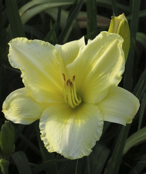 Pale yellow self with a soft, creamy hue, featuring subtle ruffled edges on the petals;
