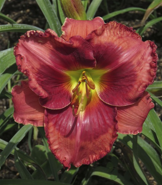 Striking, vibrant deep red with prominent large, darker red eye above chartreuse throat;