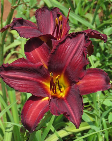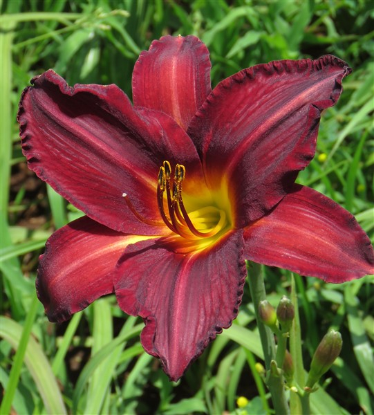 Rich maroon-red above golden throat;