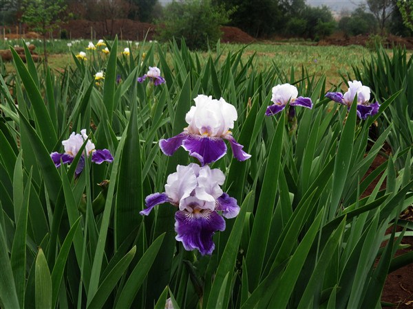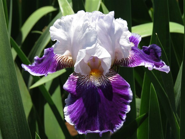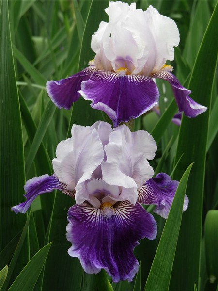 Standards: White; Falls: Purple, rimmed white; Beards: Golden yellow; Scape height: 86 cm; Bloom season: Mid; Ruffled and laced; Slight fragrance.