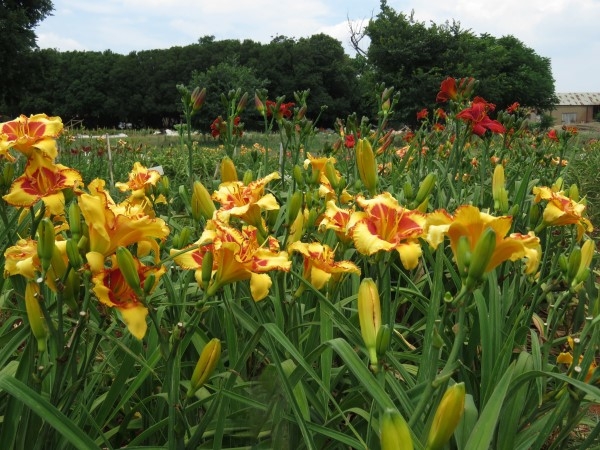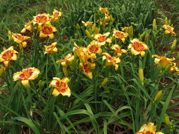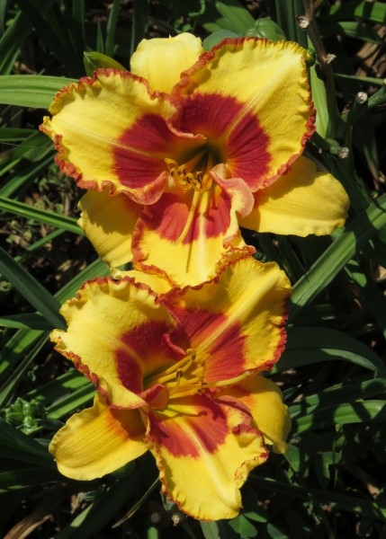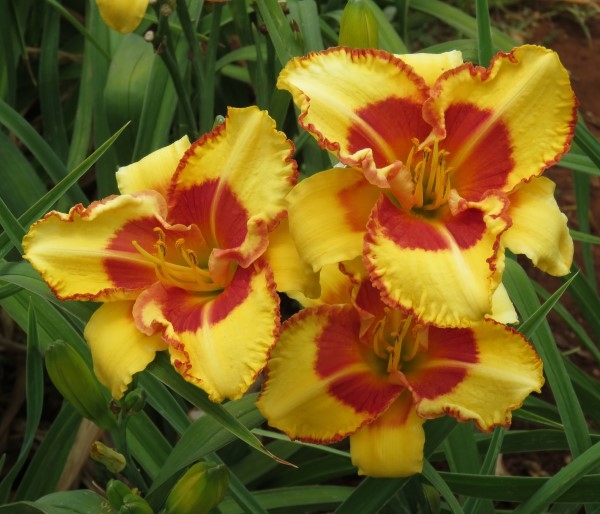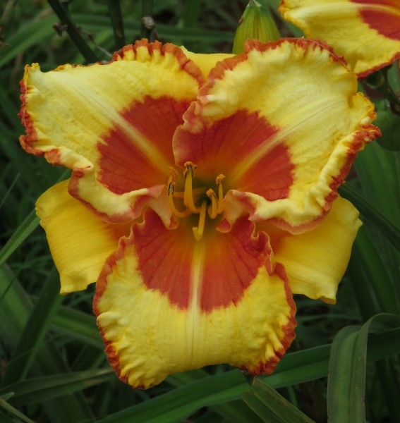 Bright yellow-orange with red eye and edge above yellow green throat;