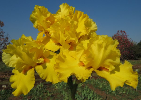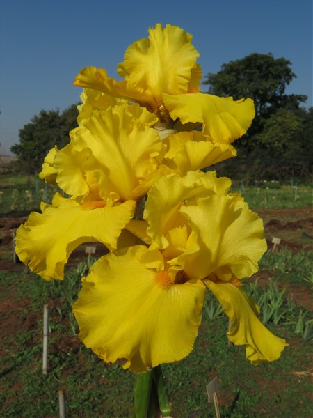 Well-formed, heavily ruffled smooth deep golden yellow flowers;