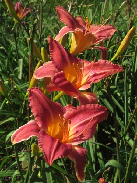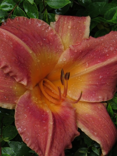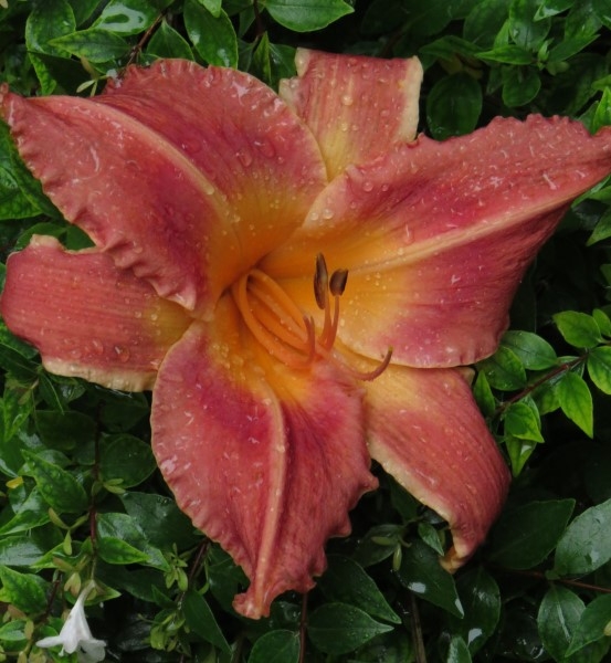 Deep coral peachy-pink self above golden yellow throat; Scape height: 87 cm; Flower size: 15 cm; Flowering season: Mid to late; Evergreen.