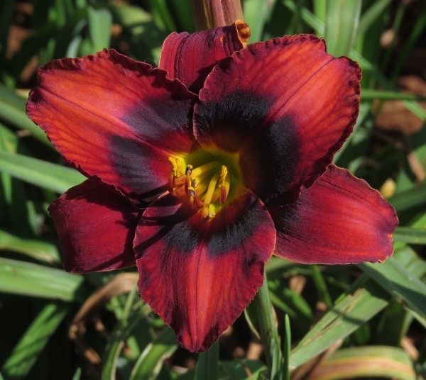 Intense red with black eye above green throat;
