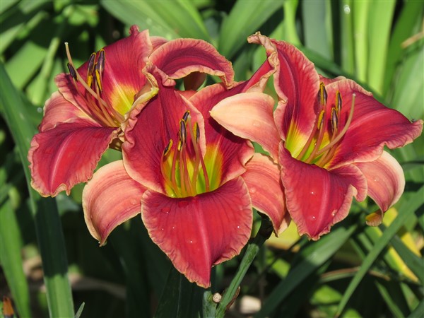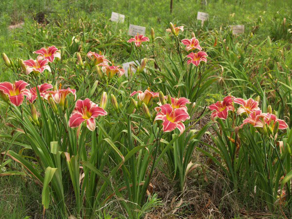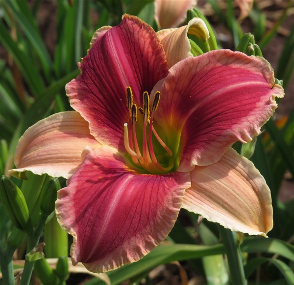 Rose pink petals with a lighter shade band around the edges; Chartreuse throat; Scape height : 78 cm; Mid season bloom; Prolific growth pattern; Extremely good branching and bud count; Slightly ruffled; Evergreen.