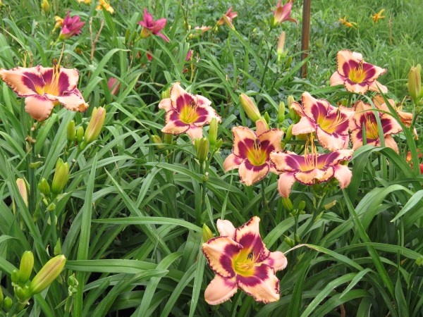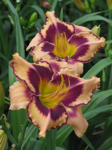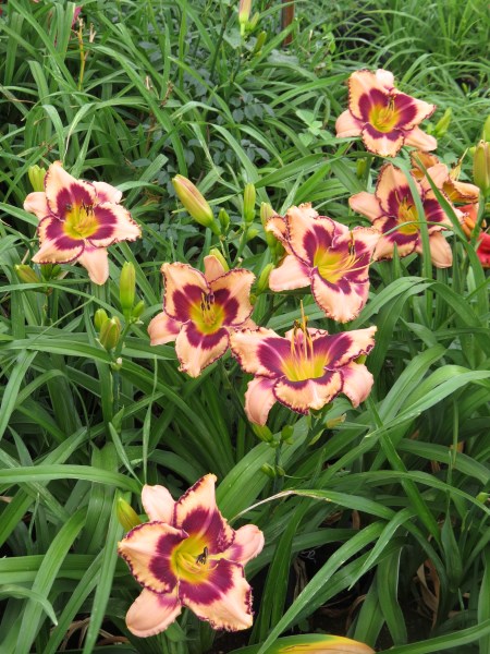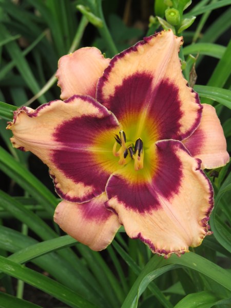 Soft peachy-pink with plum eye & edge above green throat;